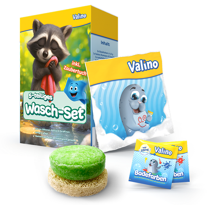Erlebe mit Valino ein einzigartiges Badeerlebnis. In Valinos Wasch-Set ist alles, was du für einen erfolgreichen Waschgang benötigst, enthalten. Zusätzlich verwandeln 2 Badefarben die Farbe des Wassers.