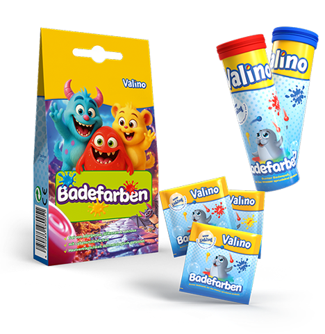 Valino Badefarben eignen sich ebenso für Drinnen wie für Draußen. Ob Badewanne oder Poolanlage, Valino garantiert unbedenklichen Badespaß für die ganze Familie.
