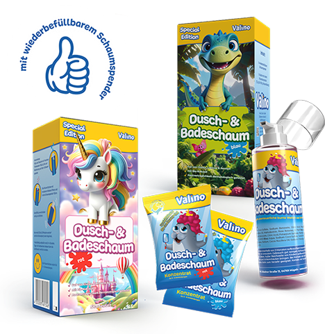 Alle Valino Badespaß Produkte sind dermatologisch getestet und für unbedenklich eingestuft worden. Sorgsam ausgewählte Inhaltstoffe sorgen für die milde Pflege und Schutz der empfindlichen Kinderhaut. Ein „zuviel“ von Valino gibt es demnach nicht.