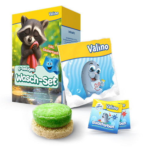 Erlebe mit Valino ein einzigartiges Badeerlebnis. In Valinos Wasch-Set ist alles, was du für einen erfolgreichen Waschgang benötigst, enthalten. Zusätzlich verwandeln 2 Badefarben die Farbe des Wassers.